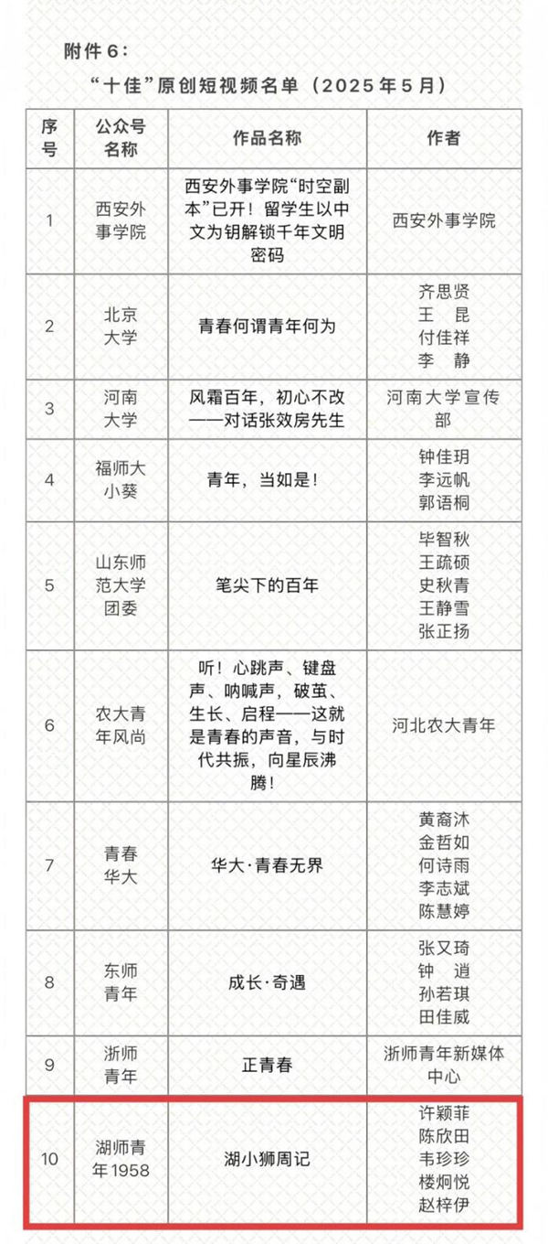 根据《高校思政类公众号重点建设实施方案》中开展优秀原创内容评审的相关要求,7月24日,高校思政类公众号重点建设项目组在中央宣传部、中央网信办、教育部、共青团中央四部委指导下,对162家建设单位推荐的470件作品开展2025年3月至5月公众号优秀原创内容评选工作。我校“湖师青年1958”全媒体工作室报送的《湖小狮周记》首次入选“十佳”原创短视频。