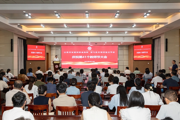 校党委书记许慧霞向为学校发展倾注心血的从教30周年教师致以崇高敬意,向加入湖师大家庭的新教师们表示热烈欢迎,向辛勤耕耘在教育教学、科研服务一线的全体教职工致以节日的诚挚问候。许慧霞传达了全市教育强市建设大会精神,她强调,要聚焦师道有承、群众有感、均衡有质、赋能有力,加快推进教育科技人才一体贯通,为创新湖州建设注入强劲动能;要以教育家精神为引领,推动广大教师持续涵养忠诚的职业品格、深厚的教育情怀、敏锐的洞察能力、过硬的教学水平、优良的师德师风;要加强内涵式发展,切实提升学校办学水平和质量,更好赋能湖州经济社会高质量发展。